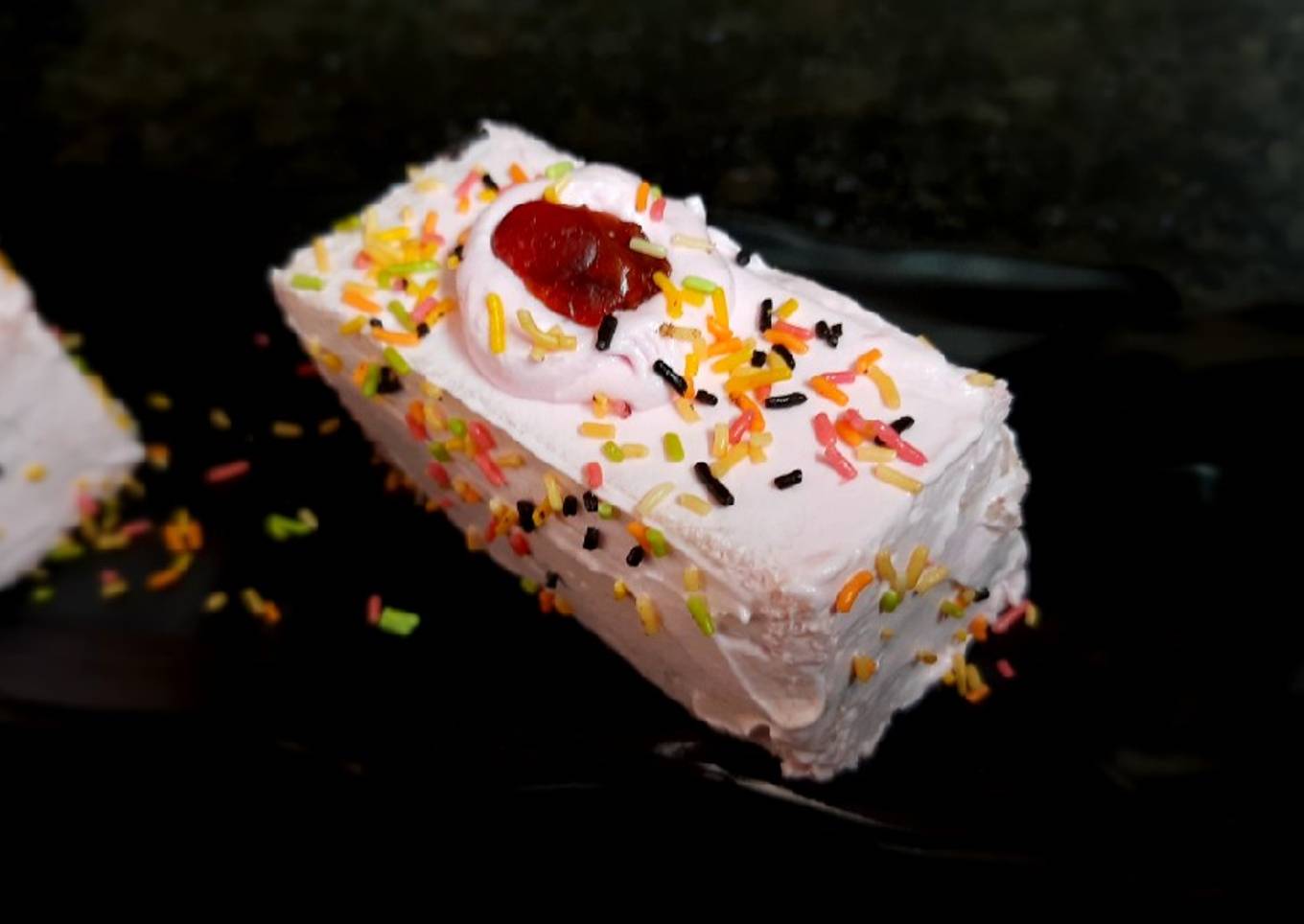 - At the top of the pastry make a flower with whipped cream and garnish the pastry with dried cherry and sprinklers at the top